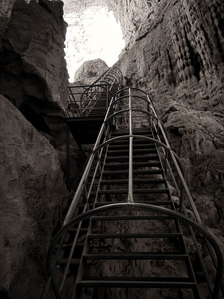 坐船后,还要爬到洞口,爬很远,最后还这样直上直下。