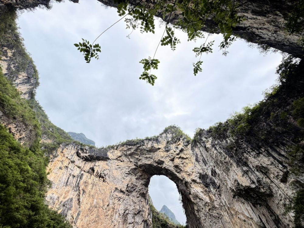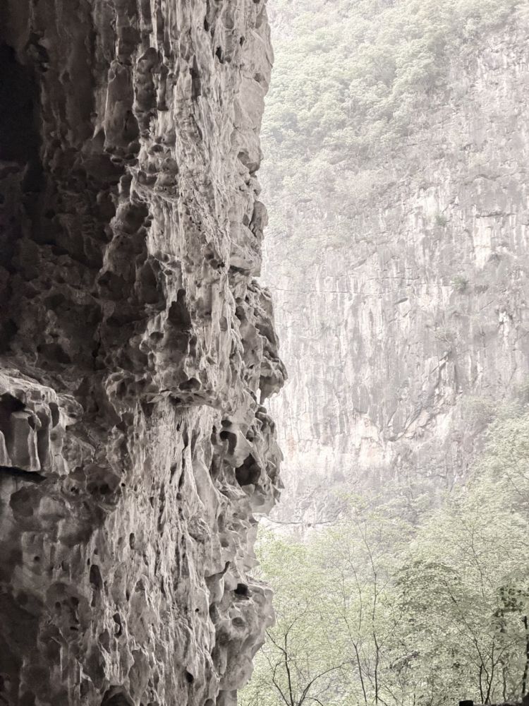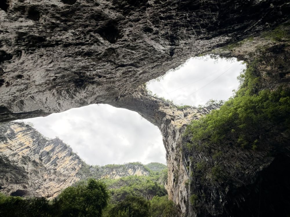 这里是走到潭边,坐船到一个大石头上,抬头拍上面的双天坑景象。