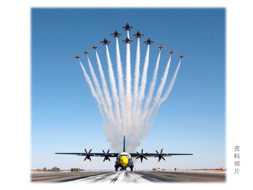 雷鸟和蓝天使两个特技飞行队分属美国空军和海军管辖,它们有各自的基地、表演日程和计划,两者的表演地点一般是不重合的。然而在特定的情况下,或者是在航展时,有时两者会同场献技。下面第一张图12架战斗机加上地面的那架C-130巨无霸,很震撼。