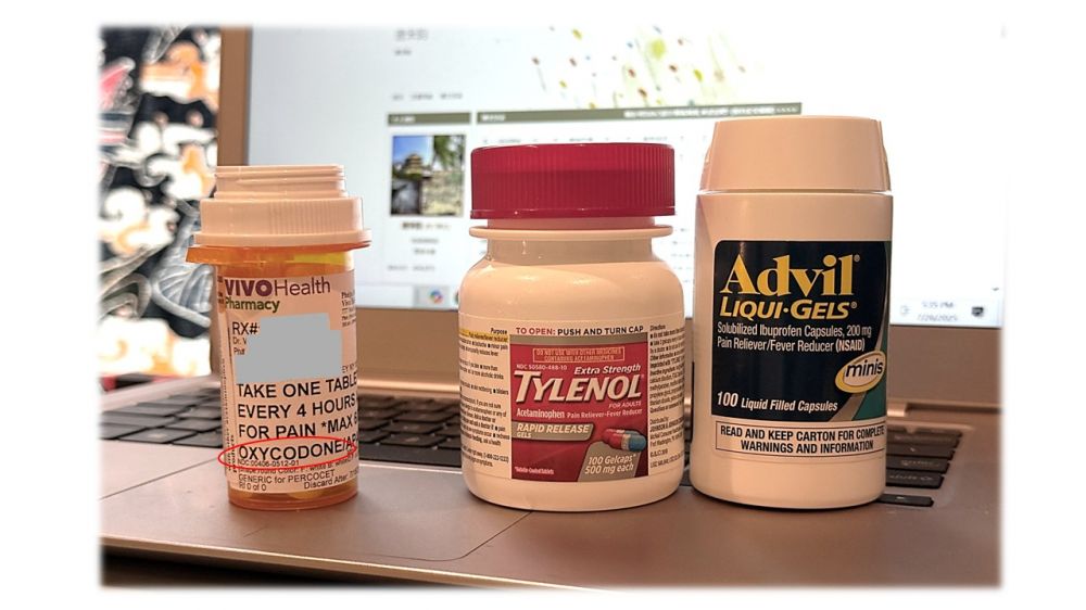 现实生活中,我完全不是一个反对药物镇痛的人。在很多情况下(这里不摊开细说了)疼痛导致痛苦的体验和不堪的生活,也影响术后的功能恢复,因此用镇痛剂去缓解是很有必要的。至于我这次手术后的疼痛,我尽可能用over-the-counter镇痛剂去缓解,效果不错。我的做法是,在术后48小时内Advil和Tylenol联合用药。在0,6,12,18,24…… 小时每次服用400 mg Advil,在3,9,15,21……小时每次服用500 mg Tylenol,它保证我能有基本睡眠,且翻身、起夜、室内走动、室外慢散步时都不感觉很痛。到了第三天,情况进一步好转,这时我就只在出去走路前30分钟服用一次400 mg Advil,到1周时,我就不需要服用镇痛剂了,每次走2公里带坡的道路也没问题。现在我认为我已经恢复90%了。