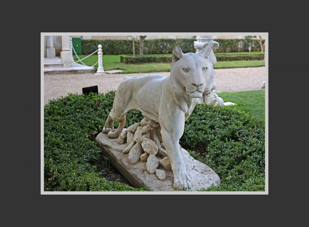 和欧洲区的几处超大型宫殿不同,贝勒贝伊宫宫是一幢不太大的建筑,整个宫殿区占地面积也不算大。因为已经到了十七世纪,建筑风格的融合非常明显,像我这种不懂建筑的人也能看出其外观吸收了欧洲艺术。建筑的白色大理石外墙,彰显庄严和豪华(至于什么派俺不懂)。前面花园里有两尊雌性狮子的石雕,栩栩如生。而宫殿大门前的那只雄狮,则显出威严之态。