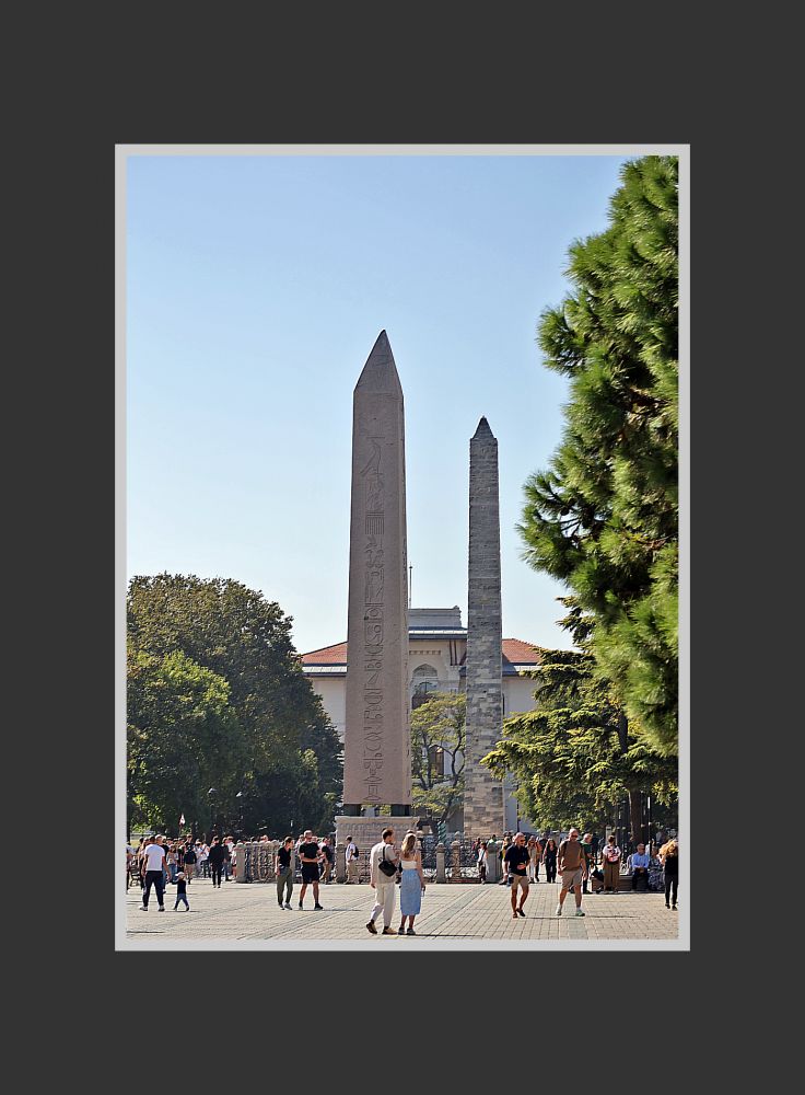 在苏丹艾哈迈德广场南侧,有两根石柱特别醒目,它们是狄奥多西方尖碑(Theodosius Obelisk,照片中稍近)和君士坦丁柱(Walled Obelisk)。狄奥多西碑是古埃及某个法老在公元前15世纪下令刻制,原来是竖立在埃及的卢克索。公元 4 世纪末,罗马皇帝狄奥多西一世(Theodosius I)下令将其运至君士坦丁堡。这是一块20米高的红色花岗岩碑,从遥远的埃及运过来,很难想象当时是如何做到的。君士坦丁柱的历史要短许多,它建于10世纪的拜占庭帝国时代。它不像狄奥多西碑那样是整体石料雕刻,而是由大块石头堆砌成形。