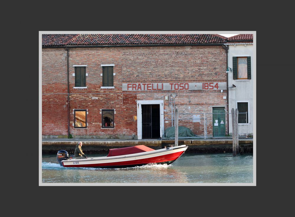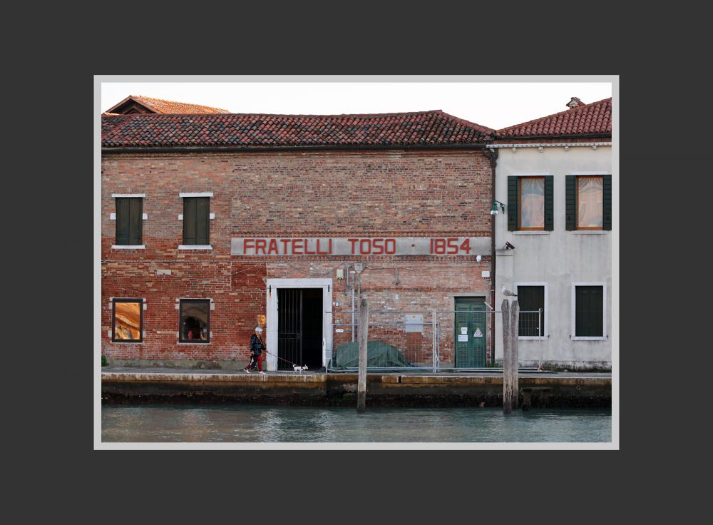这家玻璃品店位于一条比较宽阔的运河边上。朝对岸放眼望去,正对面是一座红砖建筑,显旧但比较整洁,上面“Fratelli Toso,1854”的字样清晰可见。我用手机上网查了一下,这是“Toso 兄弟玻璃艺术公司”,成立于1854年,至今在业内仍有名气。