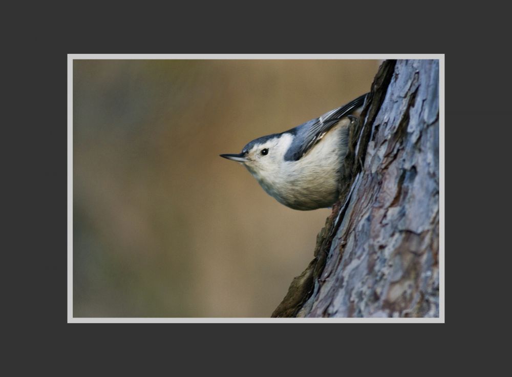 另一次的经历与之类似。那是一个初冬的周末,同样是整天没有收获。那时白天已很短,下午4点就暗下来。我缓缓地往停车场方向走,但没有完全放弃希望。我没有缩起单脚架,相机依然连在它上面倒提着,这样可以在两秒钟之内恢复拍摄。突然间我注意到一只小鸟飞到了我右侧的树上,我立刻停下来准备。一瞬间,小鸟跳到了离我不到5米的主干上,与我几乎平视,那个不到一秒的机会被我抓着了 ...... 这种nuthatch是一种较常见的鸟,我多次拍摄到,但这一张光线柔和、背景干净、姿态传神。它是耐心和坚持的结果。