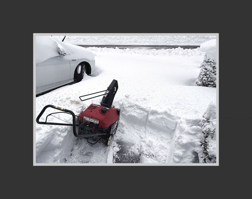 但未来若干天气温不高不低,这么厚的雪不会化掉,但白天少许融化,会在夜里结成冰。若不及时除净后患很大。于是我午饭过后硬着头皮出门。电动吹雪机不谈了,雪的厚度也远远超过我那机械吹雪机的限度。于是我只好一点点抠哧,很多时候要用雪铲把高的雪敲下来摊平,然后用机器去吹。我太太这两天不在家,没个帮手,进展很慢。