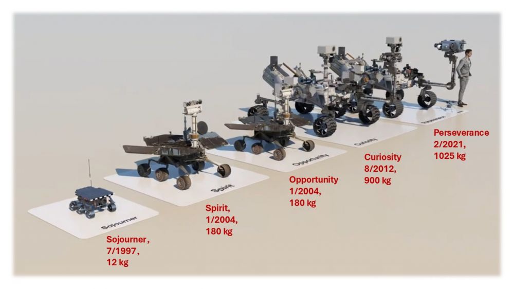 从30年前开始,人类进入了在火星表面长期自主移动、开展系统科学探测的火星车时代。先后通过飞船把5辆火星车送上火星表面 — 旅居者号(Sojourner,1997年),勇气号(Spirit,2003年)、机遇号(Opportunity,2003年),好奇号(Curiosity,2012年),毅力号(Perseverance,2021年)。