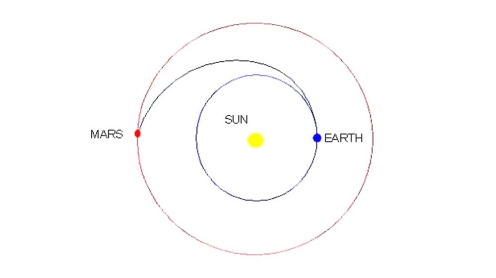 从地球出发阶段看,飞船首先必须进入近地轨道,然后通过一次或多次发动机点火,其目的是让飞船达到或略高于地球逃逸速度,并把飞行轨道与未来火星所在的位置重叠。现代任务多采用“霍曼转移轨道”(Hohmann transfer orbit),半年多后飞船轨道与火星轨道相交。飞船的整个飞行距离约5亿公里,要飞七个月左右。这是一条与火星渐行渐近的弧线。