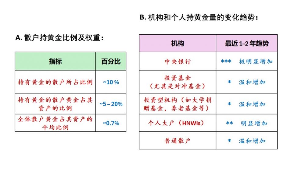 中文说的资本市场的“大户”,英文叫HNWIs(high-net-worth individuals, 高净值个体),也就是知产至少几百万以上的大户,这部分人很分化,“金融型”的大户黄金ETF可占到80%;而偏“保值型”大户,持有的实物黄金可高达80%。