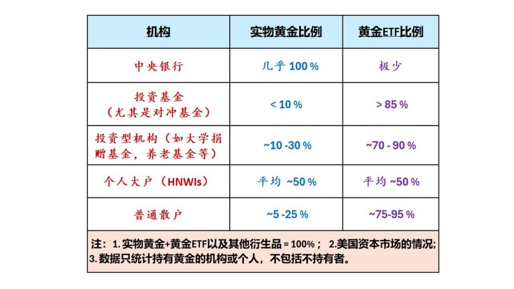 我上面这张表下面注明了,这些百分比是持有黄金的那部分机构或个人所持的的“真黄金” vs “纸黄金”的百分比(加在一起是100%)。其实那五种机构或个人,大多数完全不持有黄金,少部分持有者,黄金在其总资产中的比例也不大。