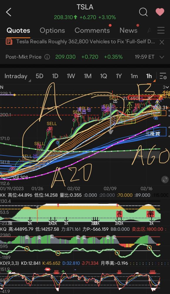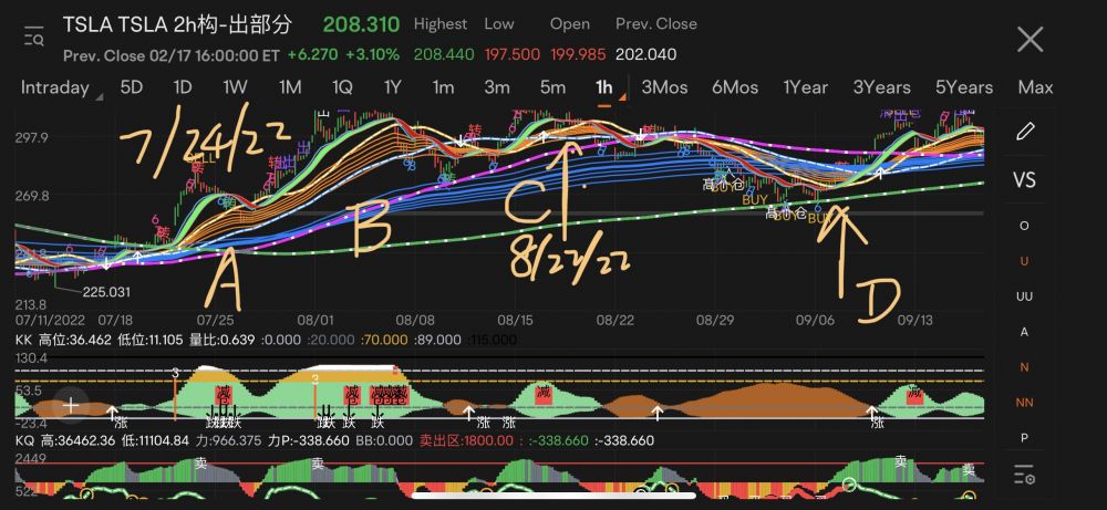 特斯拉强势上涨了两大波, “A”和“B”, 我认为应该有第三波。原以为会在175-205 震荡, 结果是187-217.