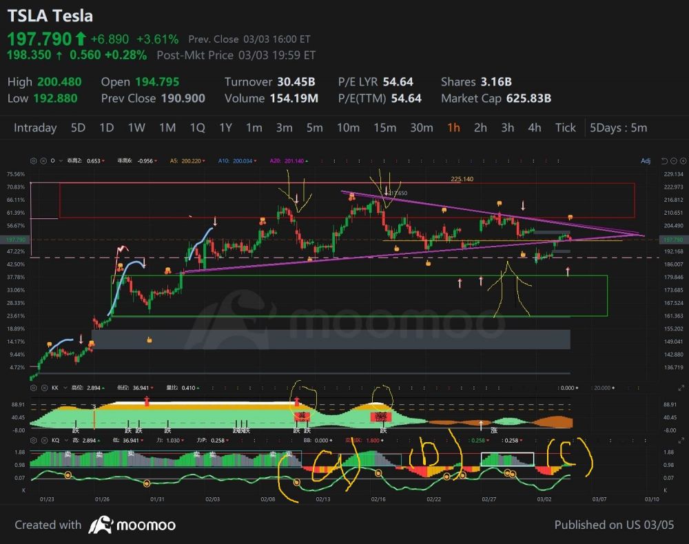 正如我前文预料,TSLA出第三波,已从$193 反弹到 $211,图-1。 尽管在3/2/2023那天下调至186(E13线支撑),随着大盘强劲反弹而回补了 $193-$202缺口的大部分升到$200, 之后稍微休整回到收敛三角的下线,图-2。