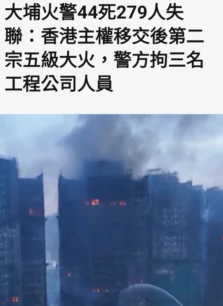 我看香港官方電視台公布的數字:截至11月27日凌晨五點,大火已經造成44人死亡,279人失蹤的悲劇。