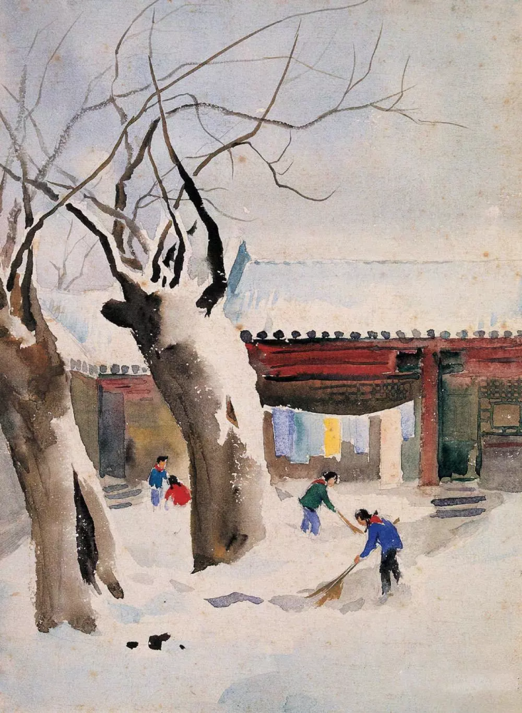 扫雪:古院枯树,瑞雪封门,少儿的扫帚挥去的是积雪,留下的是与人方便的热情。点点红色暖调与大片雪白冷色的强烈对比,燃起观者心中阵阵暖意。