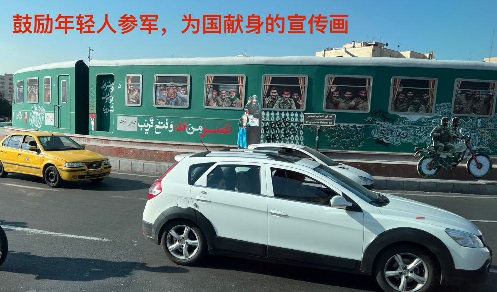 在德黑兰的街头,看到了做成火车列车型状的环形宣传壁墙