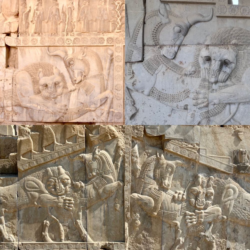 这些浮雕是要反复地向各附属国炫耀虽然波斯帝国像猛狮一样的强盛无敌举世无双,但是波斯王友善慈详,绝不恃强凌弱,甚至连自家里养的狮子猛兽也是如此友善至极,不杀生。那时候艺术家们的情商和智商加上安邦与外交的政治智慧真是非常的高超。