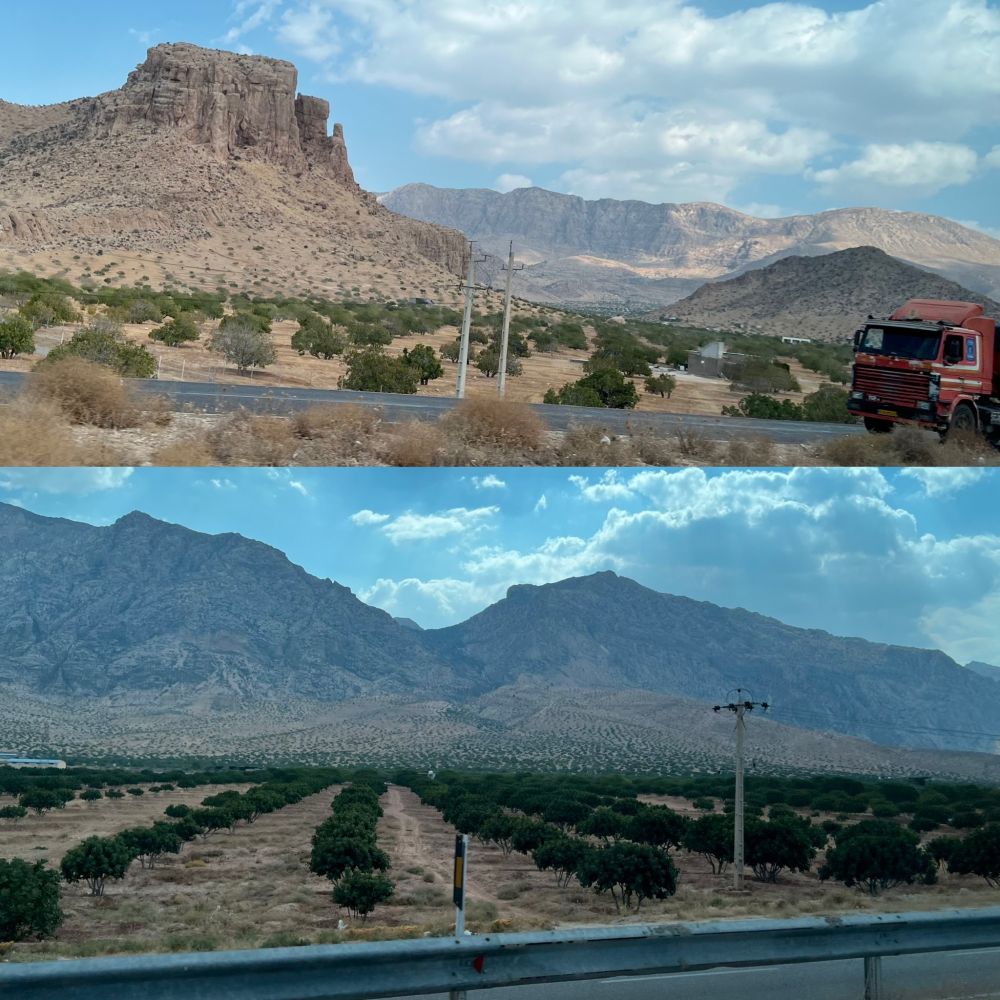 沿途经过一个几十公里连绵不断的无花果树栽培基地,并且一直延伸到远方的山脚下。导游介绍伊朗是世界上最大的浆果和核果(如无花果、石榴、椰枣和樱桃)生产国。