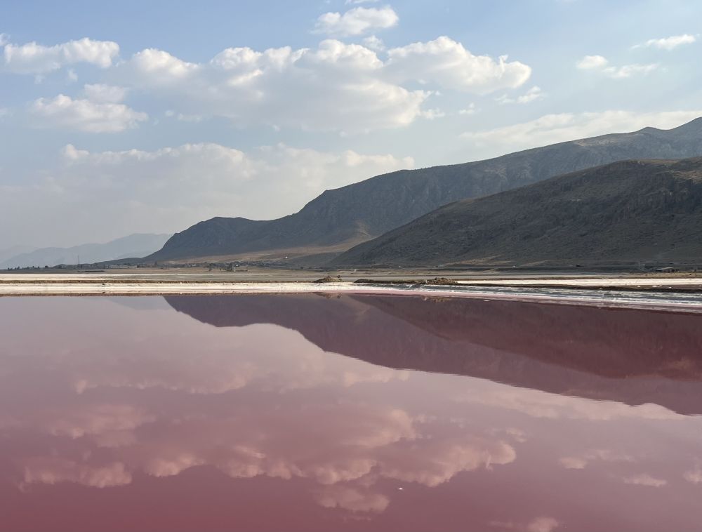 高盐浓度下生长的特殊微生物将湖面染成粉红色。