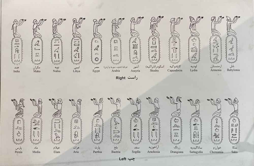阿帕达纳宫最惹眼的是北东两侧的台阶,上面布满了精美的浮雕记述着从印度河到埃及横跨三大洲的辽阔地域里的28个附属国的使团觐见波斯王和虔诚进献贡品的场面。通过呈现人像各异的服饰和各种精美贡品便可将他们一一分辨开来。