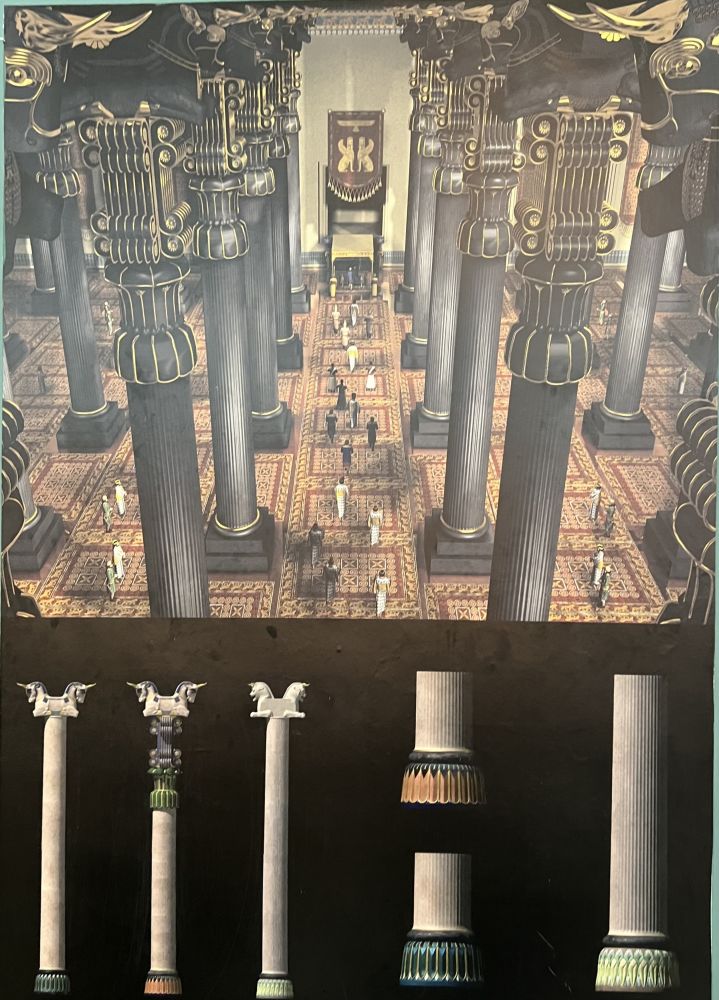 宏伟的会客大厅为正方形,各边长83米,有72根石柱,石柱顶端是狮、鹰、马和牛等动物的双头像,门上装饰有飞牛图案。现如今仍有13根伫立在巨大的平台之上,豪华奢侈宏大场面可窥一斑。