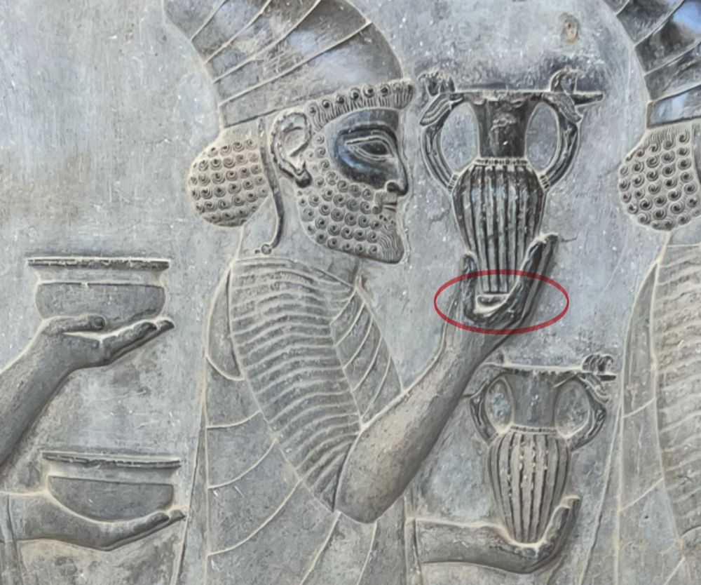 导游让我们注意看中间的那个举着两个精致酒壶的进贡者的右手中指垫在酒瓶底下。这样长时间地托举着酒瓶也不累,而且还稳当。