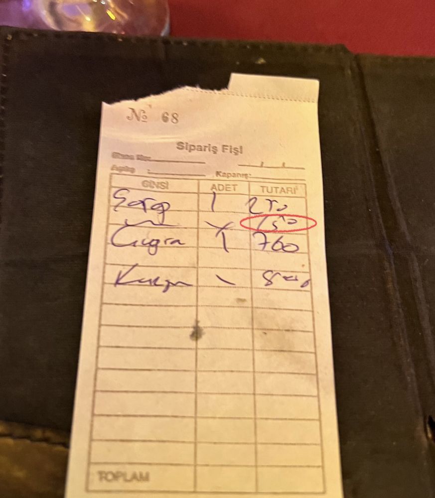 另一次在新城区步行街,被站街的小伙子服务员热情地招呼进了餐馆。这顿饭共点了三个菜,一碗炖羊肉(羊肉切成仅有半个指甲盖大而且顶多有十几粒),一盘烤鱼(也只不过3-4两的个头)和一个汤,最后又被加收了150TL服务费,而且这笔服务钱是很隐晦地被加在三个菜单之间,而不是列在菜单总计价的下面(下图),若不留心地看一下账单就会错过了。