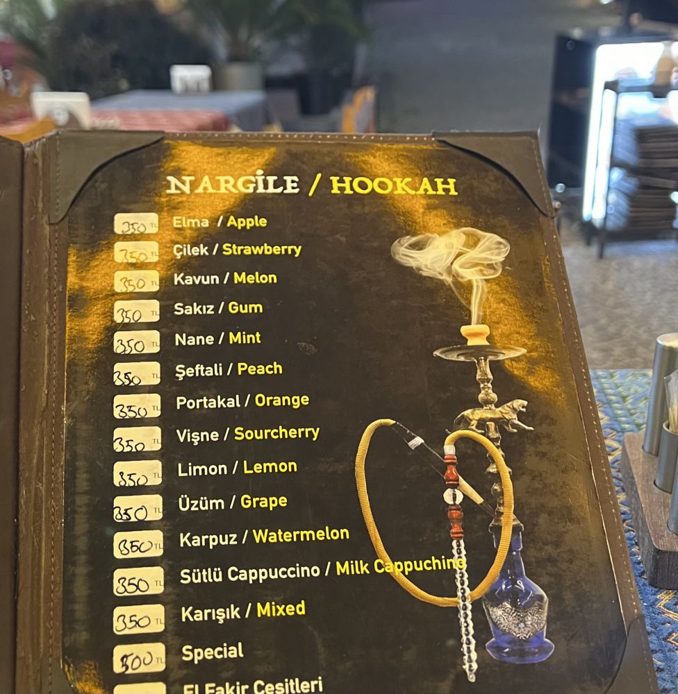 几乎所有的餐厅的菜单上还有"土耳其大烟“,并在烟丝里掺入了各种水果香料,大约是10美元一袋烟。烟头处还有可供替换的烟嘴,供客人们轮流抽烟.经常看到青年男女五六个围坐在一个桌子上轮流抽烟聊天,也是当地的一景。