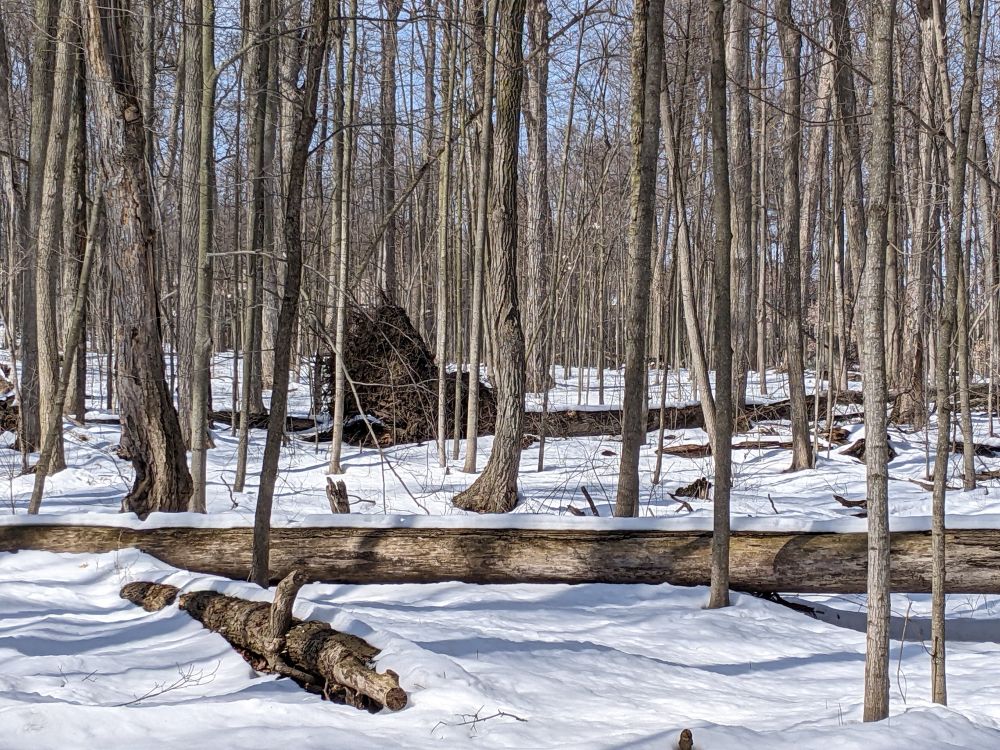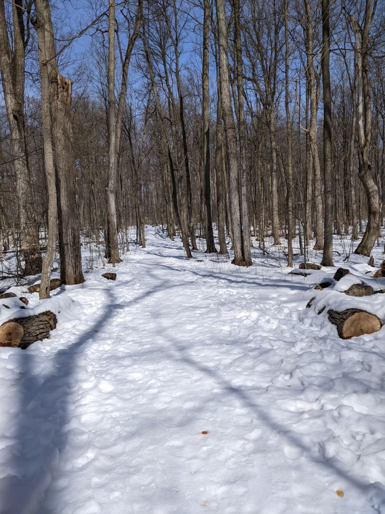 林中大部分是高耸直立的枫树。每年晚秋,树枝上挂的,地面铺的全是红色或金黄色的枫叶,美不胜收。如今落叶已化泥土,掩于雪下,仅留下无数裸露出灰褐本色的光秃秃树干与枯枝。虽然美色缺失,但视野开阔,抬头能看到蓝天白云,举目可望穿树林。环顾四周, 感觉并不凄凉,反而有些舒畅。