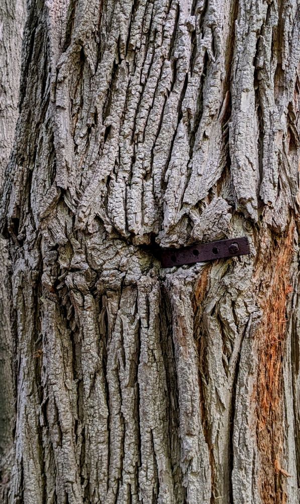 顾名思义,Sugarbush里的树应以糖枫品种为主。全世界75%的枫糖产自加拿大,3月正是采集枫树糖浆的季节,公园里不允许出现商业行为。但作为“遗产公园”,还是有先人活动的行踪可循。在一颗老树的躯干上,清晰可见一条锈迹斑斑的铁片横镶在树皮间,上面铸了几个小眼,大概当年森林主人就是用它来挂收集糖浆的小桶吧。
