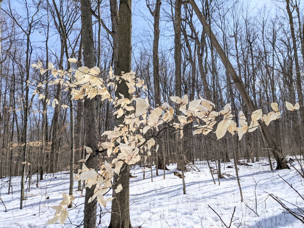 但真正让我们眼睛一亮的,是散见于枫林中的American beech树叶。那些薄薄的米黄色叶片大约1公分宽3-4公分长,牢牢地系在细长的枝条上,随风摇曳,在光秃秃的枫林中,特别醒目。难以置信,它们竟能抗击一个冬天的严寒冰雪与风暴摧残,是何等坚韧!多么顽强!
