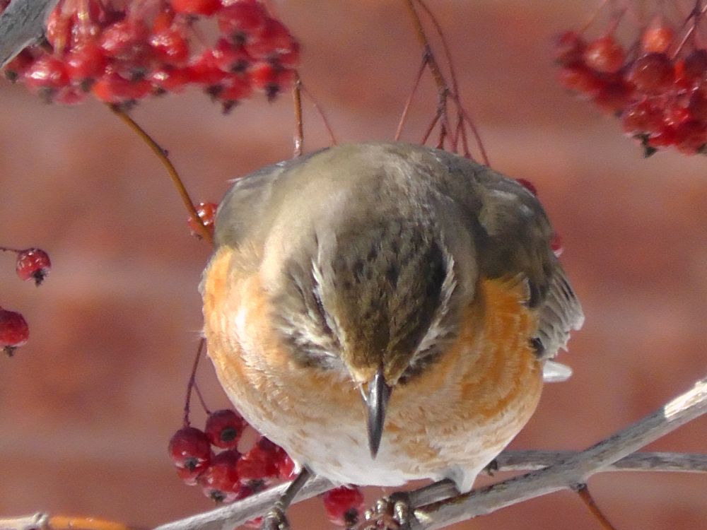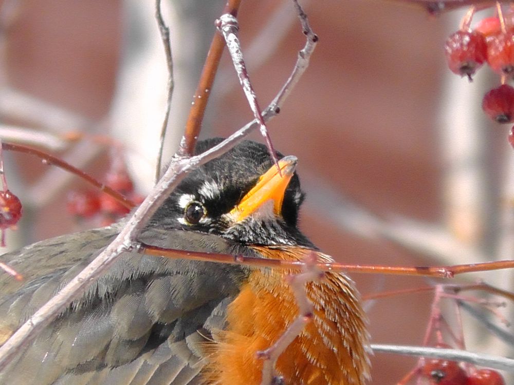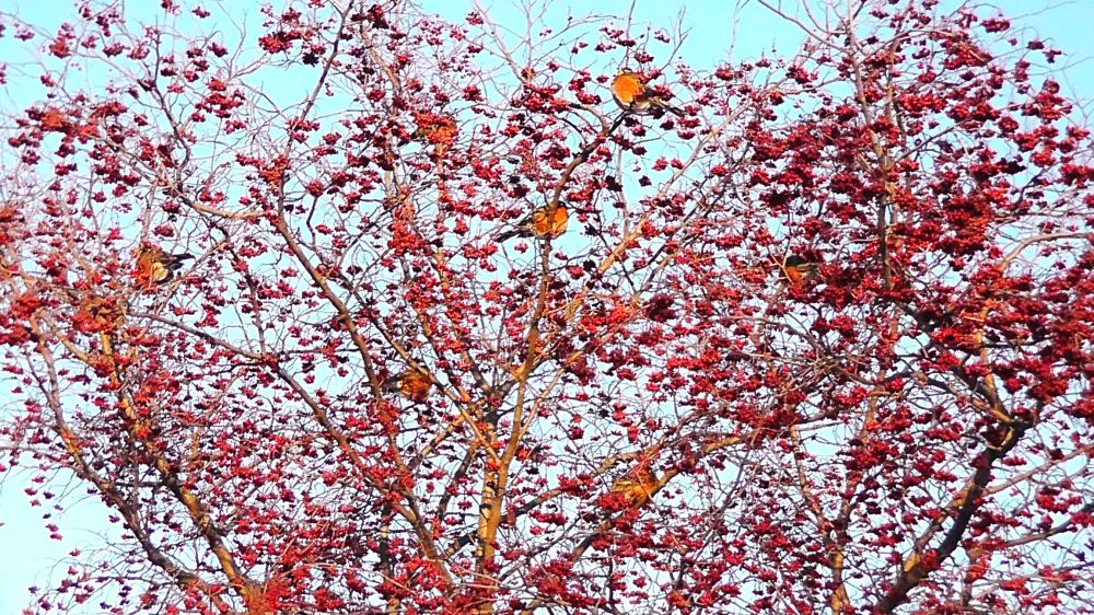 或许,我家门口山楂树上的红果是冬季吸引它们来觅食的主因,而且,气温越低,越是冰天雪地之时,来的知更鸟越多。大概在这些时日,它们不仅在白雪覆盖的地面找不到各种脊椎动物,而且在树林里也难找到其它的植物果实吧。