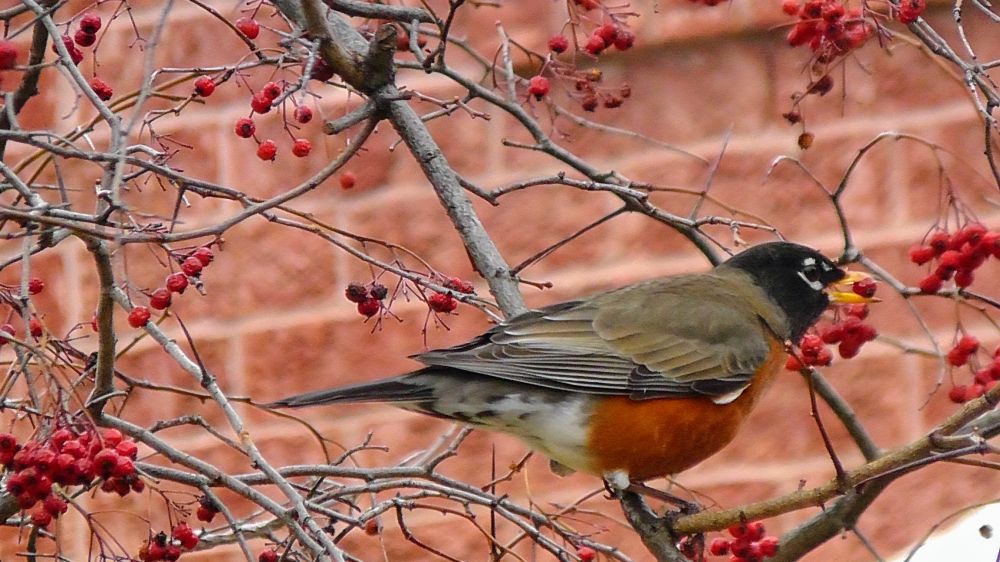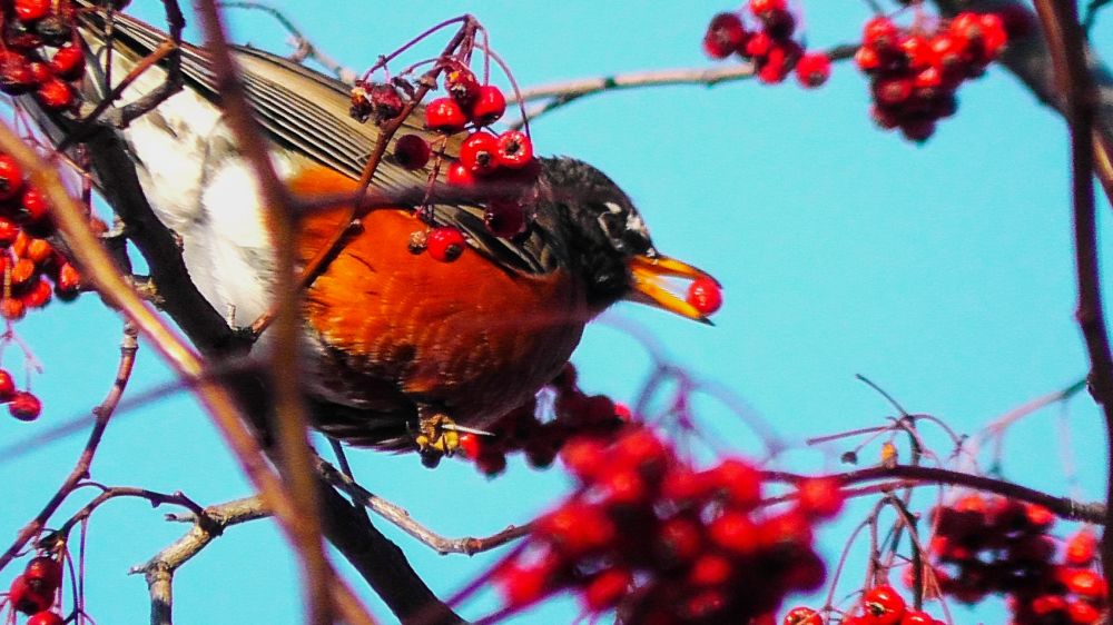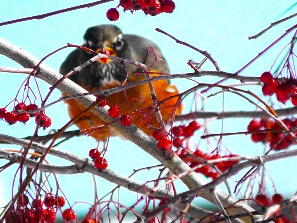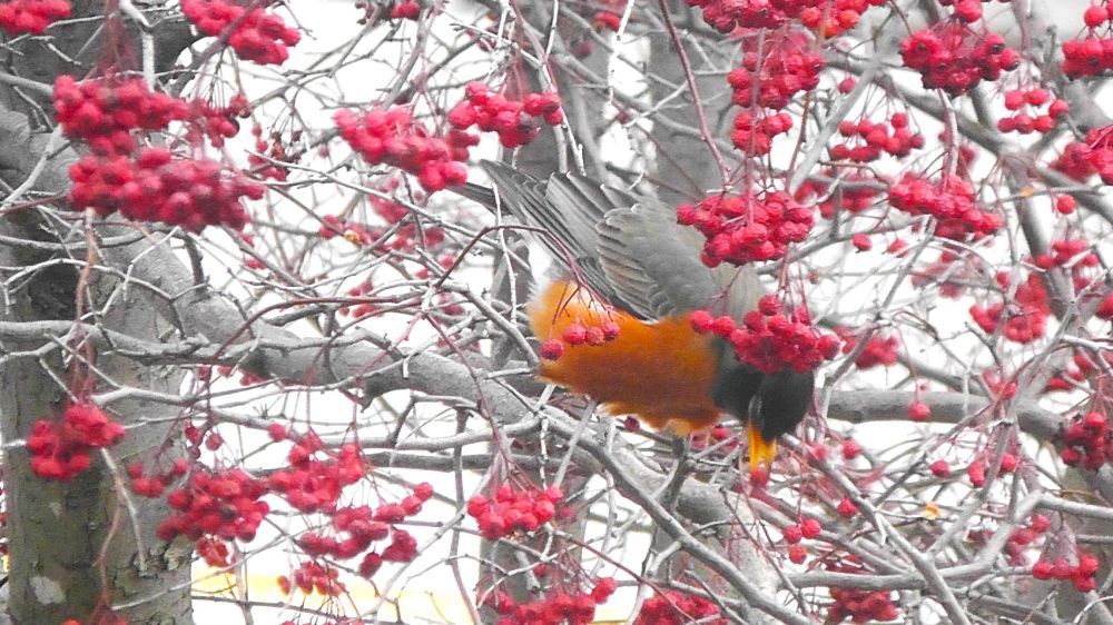 有网文作者观察到:"冰天雪地里,它们 (那些留在北方的美洲知更鸟) 只出没于林中,寻找树上挂着的干果和莓果。"
