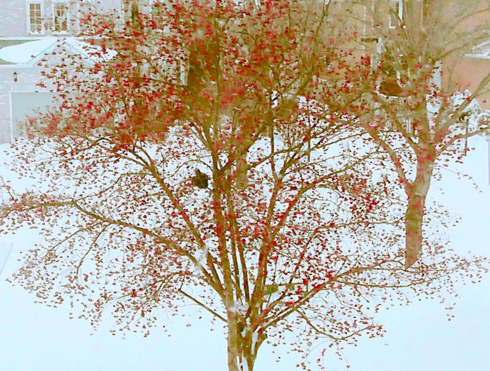 机灵的松鼠也有失算的时候。2022年1月18日,一场来势凶猛的暴雪在不到10小时内向地面倾倒了大约40-50公分厚的积雪,它将一只松鼠困在山楂树上整整一天。或许由于暴雪来得太快,或许没有鸟雀和人的打扰,松鼠忘乎所以地在树上美美饱食后,才发觉自己面临的困境。它沿着树干,下溜上爬,几个来回,反复试探,最终才省悟到积雪太厚,下地将寸步难行,无可奈何,它爬回高处紧抱根粗树枝躺了一天有余。幸好,有它厚厚的皮毛保护,松鼠还不至于冻死在树上。雪停后,我第二天一早出门铲雪,开辟了通道,它立刻嗖地一下溜了下来,赶紧逃走, 连打招呼的“吱吱”声也没有。