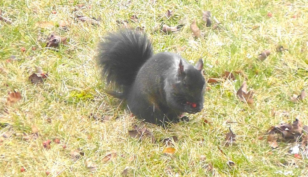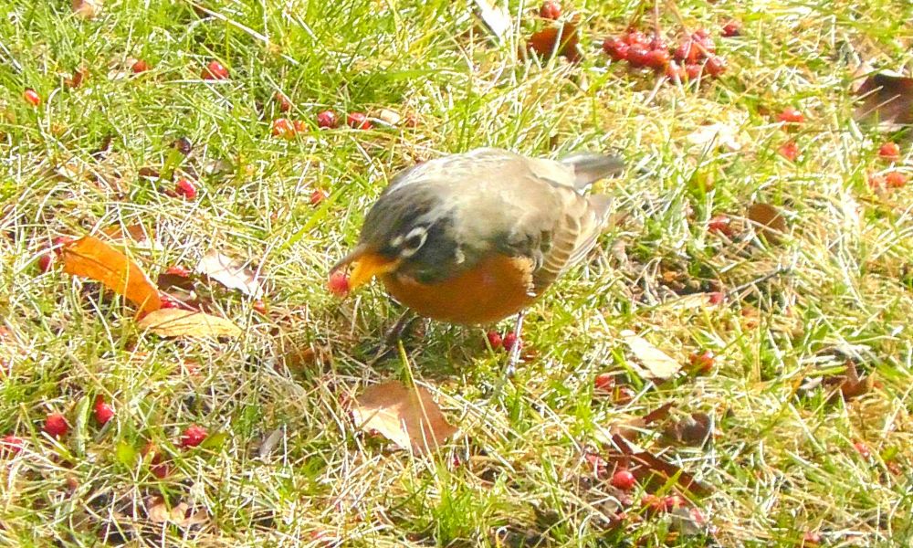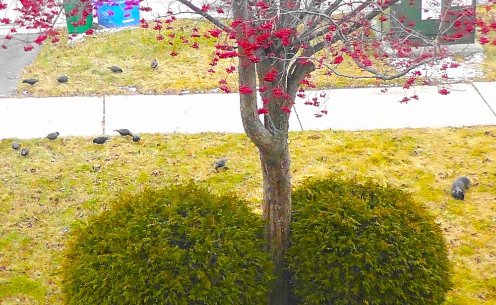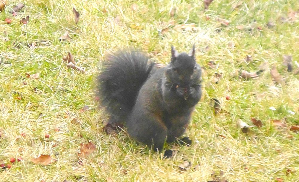 偶尔,我也看到鸟鼠抢食的场面。 10天前,一次狂风过后,大量的山楂果被吹落到枯黄的草地上,成群的美洲知更鸟飞来啄食,有只比较廋的黑松鼠也混杂其中,或许它真的饿了。知更鸟虽众,也只能用坚硬的长嘴一粒粒地啄食,而拥有四条腿的松鼠,则发挥了自己的优势,它左右开弓,用两只前脚,大把大把地抓起山楂就往嘴巴里塞,而且,松鼠过往之处,几乎颗粒不剩,将战场打扫得干干净净。