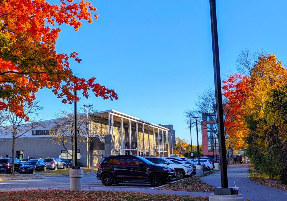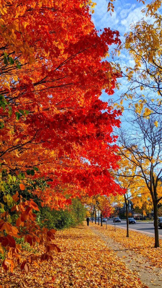 时至10月底,外面温度虽然仅6°C,但天晴,太阳照在身上,感觉暖融融的。深秋正是安省一年中景色最美的季节,临近图书馆的左侧路边有一大片原生态树林,夹杂在低矮灌木林丛中长了一棵棵枝繁叶茂的高大枫树,靠汽车道的右侧,栽种了一长排已经落叶过半的美洲皂荚树,在蓝天白云的陪衬和明媚阳光的照耀下,枫树叶红艳似火,皂荚叶金黄灿烂;它们交相辉映,斑斓绚丽;草地和路面早已铺了一层重重叠叠略有褪色的落叶,每走一步,都能听到踩碎叶子的唦唦声响;阵阵秋风吹来,正凋零飘落的叶片随之飞扬起舞,红黄紫橘,色彩缤纷,我不由自主地从衣兜里掏出手机拍照,也算是自我陶醉,臭美一下!