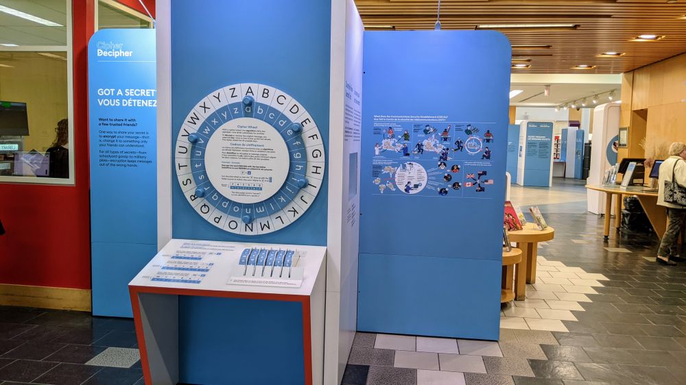 刚进大门,就看到BCRL在搞一个名为Cipher | Decipher的科技教育活动,图书馆大厅到处摆了有文字说明和互动的展品。其宣传资料介绍,这个活动主要服务对象是小学3-6年级的学生,展期从9月中旬至12月中旬。"这是个有关密码学和网络安全的 (英/法)双语互动展览。帮助小孩子学习基本的破解密码的技能,并且可以近距离观察一台真正的 Enigma 密码机。” 配合这个活动,BCRL还举办了几个相关讲座。