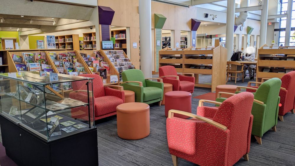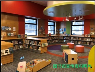 图书馆仅一层,面积为36,500平方英尺,分儿童区、青少年区、阅读区、会议室、学习讨论间等。阅读区有各种各样、分门别类的书架,供看录像、玩游戏、听音乐等的音像设备,查资料的计算机,以及桌椅沙发,当然,还有Information Desk 和Circulation Desk等等。