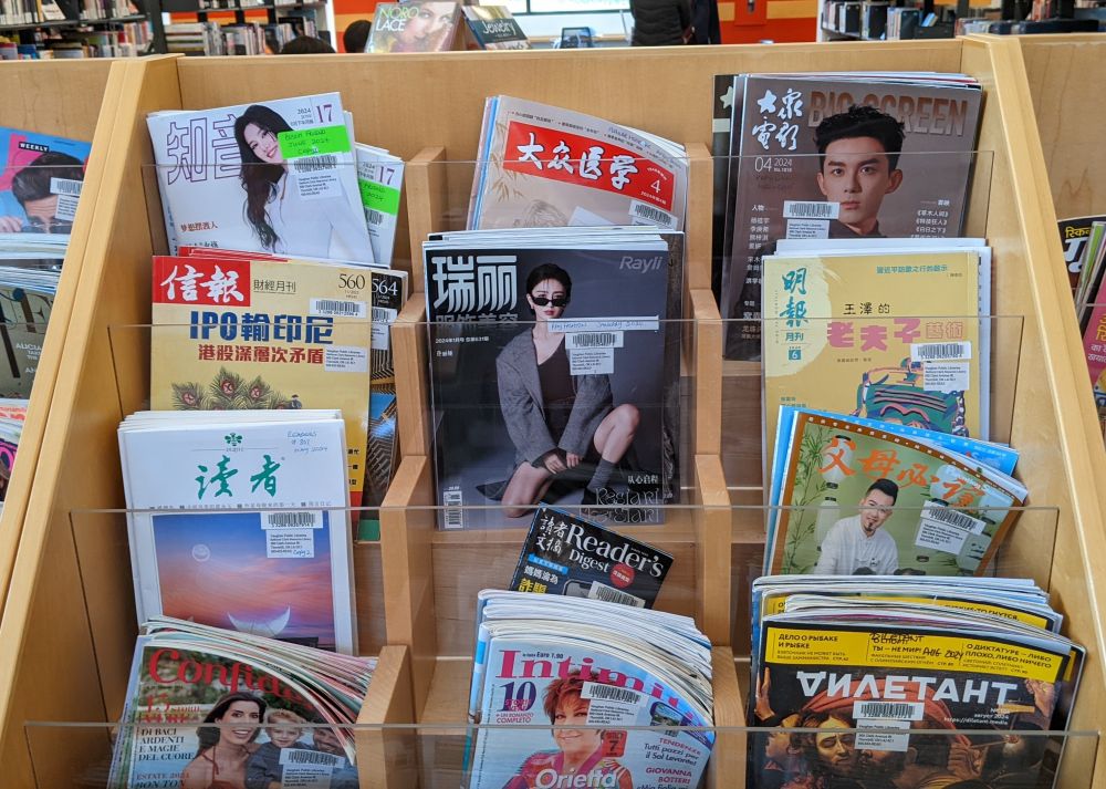 除了官方语言的英/法文,其他语种的资料都放在多元文化区,报刊例外。为方便读者,每个书架的尽头分别标明了"中文"、"韩文"、"越南文"、"俄文"、"意大利文"、"犹太文"、"阿拉伯文", 等等。