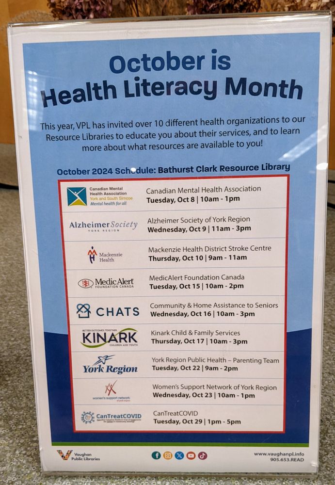 出大门前,我将随身所带的图书馆证和杂志在流通扫描机过了一下,在VPL系统里留下借物记录。恰好看到扫描机旁的一块公共告示牌,上面大字写着October is Health Literacy Month, 它具体列出了十月份由BCRL和不同医疗保健服务机构共同在馆内举办的9次公共讲座的时间表,这些医疗保健机构分别与心理健康,老年痴呆,居家护理,妇女保健,癌症治疗等等有关。