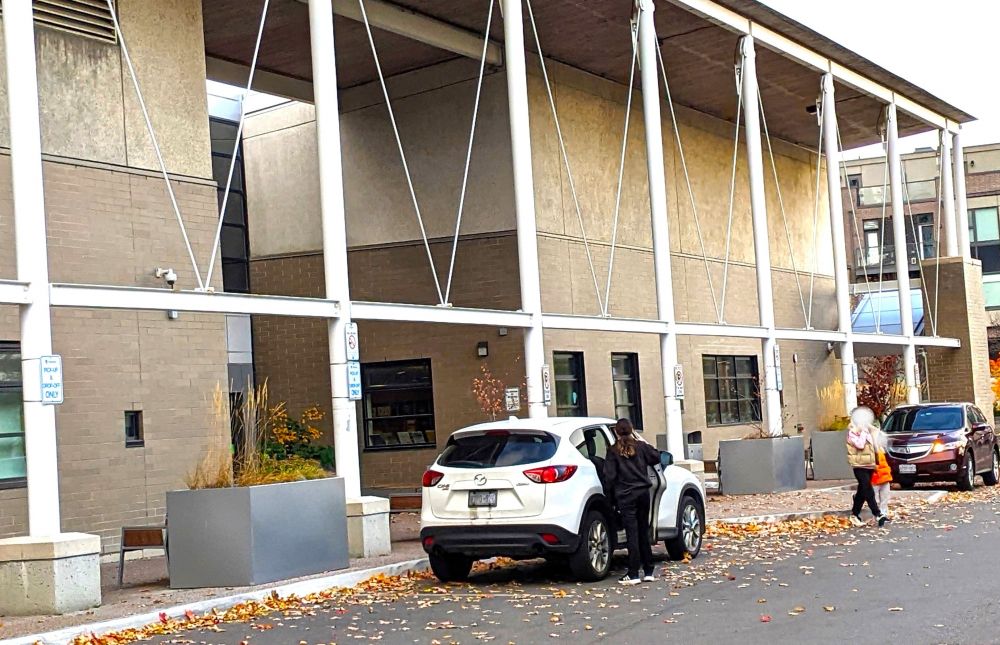 不及10分钟我就走到了图书馆。虽是周末,而且刚过10点,进出图书馆的人不少。有一对看似夫妻的中年人共同用手提(或"抬")了一个鼓鼓囊囊的布袋子走来,里面大概装满了该还的书籍或DVD/CD等;一个年轻母亲手牵小孩从图书馆出来朝停车场走去,或许已经归还了所借图书馆的资料准备回家;一个女孩正从停在图书馆门口没熄火的汽车走出,待她从后座拿出书包后,汽车就一溜烟地开走了,估计是家长送女儿来图书馆查资料做作业等。