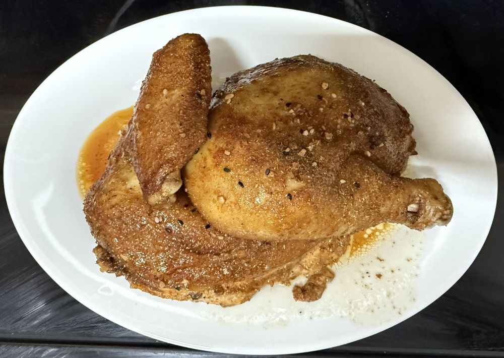 周末专门买了阿米西农场的散养鸡,按照小高姐的步骤,先拆骨把鸡摊平在盆中,用佐料及酱油腌制一晚,第二天放入烤盘倒入足够的油把鸡浸入油里,烤箱设300度烤一个半小时。(详细步骤可参考小高姐的油管视频)。