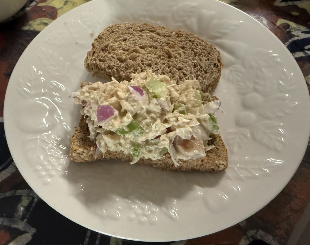 最近做了一次,用了两罐Costco的tuna, 用叉子搅碎鱼块,一个紫洋葱和四,五根西芹切碎,四勺美乃滋(根据个人喜好加减),1/2 teaspoon 盐,少许黑胡椒粉,充分拌匀即成。
