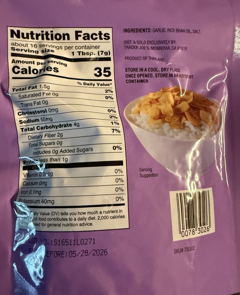 大蒜脆片,这是一个新发现。 尝了几个感觉出蒜香和爽脆略有点苦味,放在沙拉里作为添加蒜香脆片应该不错。
