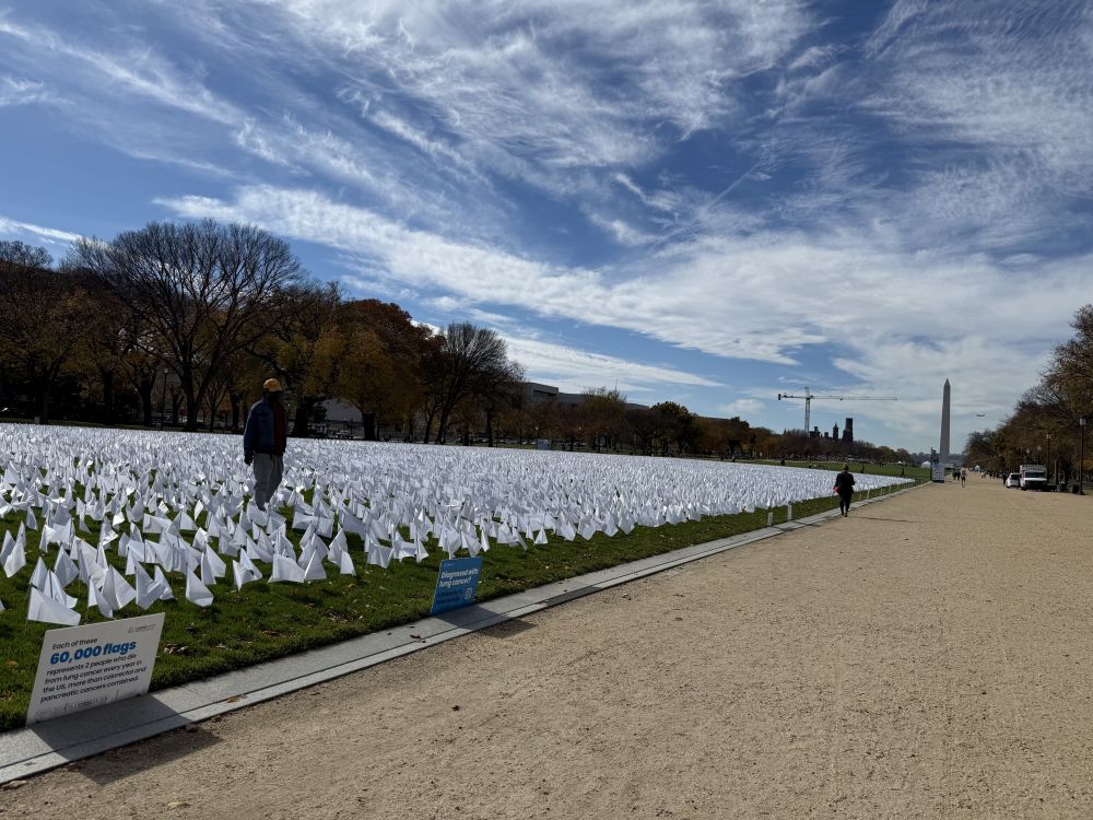 国家广场插了好多小白旗,有六万个,每一个代表两个死于肺癌的。
