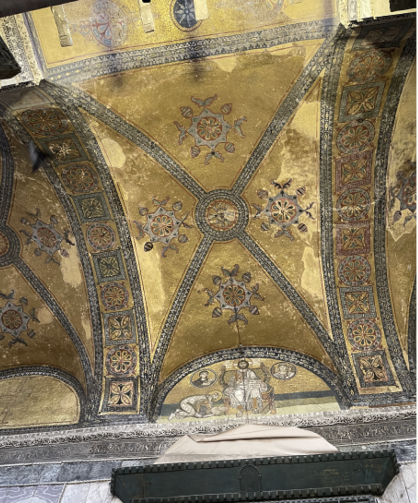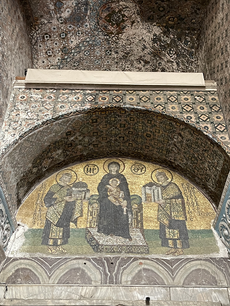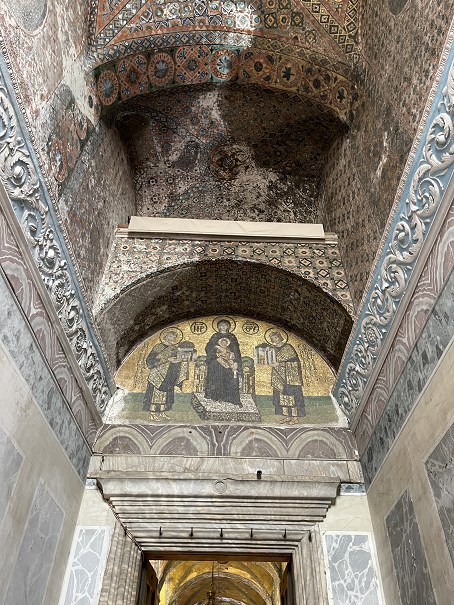 拜占庭风格的回廊上方的马赛克镶嵌壁画还清晰可见。 这幅画表现的是奉献君士坦丁堡城市模型和圣索菲亚大教堂模型给圣母玛丽亚和耶稣(圣母玛利亚位于中央,小耶稣坐在母亲的膝盖上,两边分别是君士坦丁一世和查士丁尼一世)。