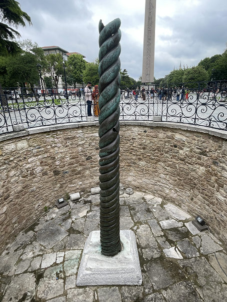蛇柱 (Serpent Column) 是希腊人为了纪念在普拉提亚战役(公元前479年)中击败波斯帝国而用青铜建造的, 最初立在希腊的德菲 (Delphi), 公元324年被君士坦丁大帝迁来君士坦丁堡, 直到17世纪末仍保持完好。 到1700年时上面的3个蛇头已经丢失, 现在旁边的伊斯坦布尔考古博物馆里只有一个蛇头的上颚部分还在。现在这个蛇柱的底部就是当年竞技场的floor level.
