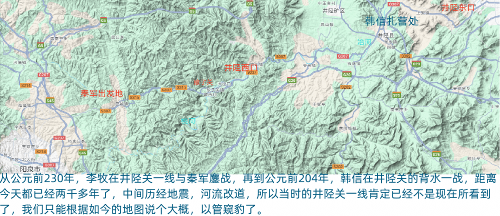 从今天的地图可以看出,标出的秦军出发地阳泉的巨城镇,到井陉关的第一个小平地南峪镇中间距离今天是八十公里,但还是公路,这还是隧道,桥梁之后的,过去古代,那要翻一倍,是要走200里山路差不多,在这200里地里全部是山峦险道,秦军是没有宿营囤积粮草地方的,这就是如同一条巨大宽阔的山峰河流,只有秦军攻占了井陉西口。才能占领第一个平地或者是南峪镇,或者是天长镇,才有了安营扎寨,囤积粮草器械补给的桥头堡,所以李牧防守井陉关,就要确保井陉西口安然无事。如果比喻井陉西口就是外城门,那么井陉东口就是内城门,或者就是井陉西口就是家里的大门,井陉东口就是卧室大门。如果秦军冲破井陉东口“井陉关”,即“土门关”,占领井陉县,华北平原最后屏障就被攻破,无险可阻的华北平原只能成为任人宰割的羔羊。