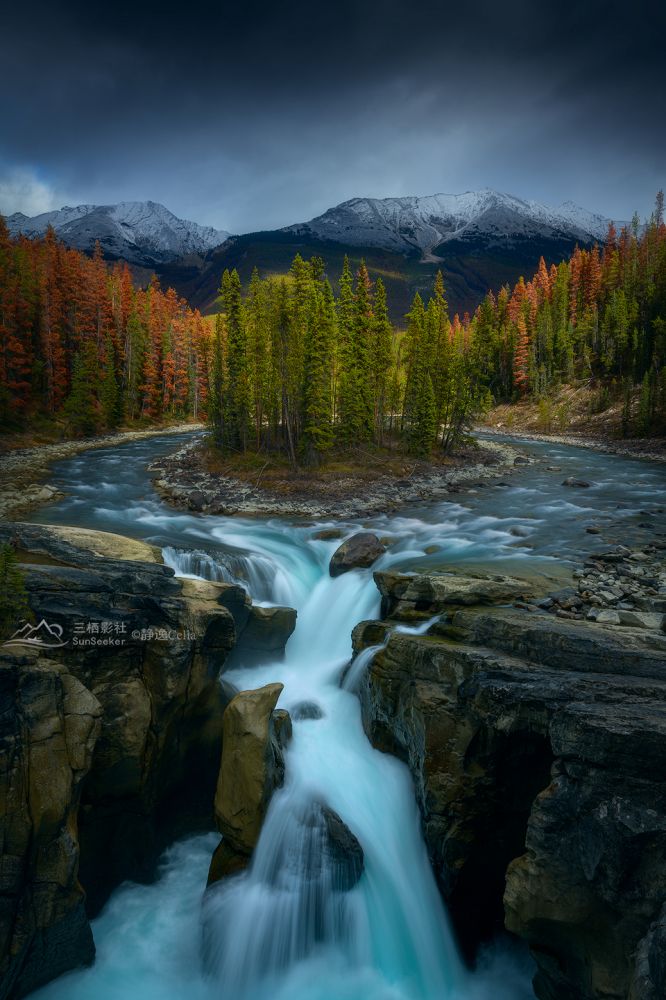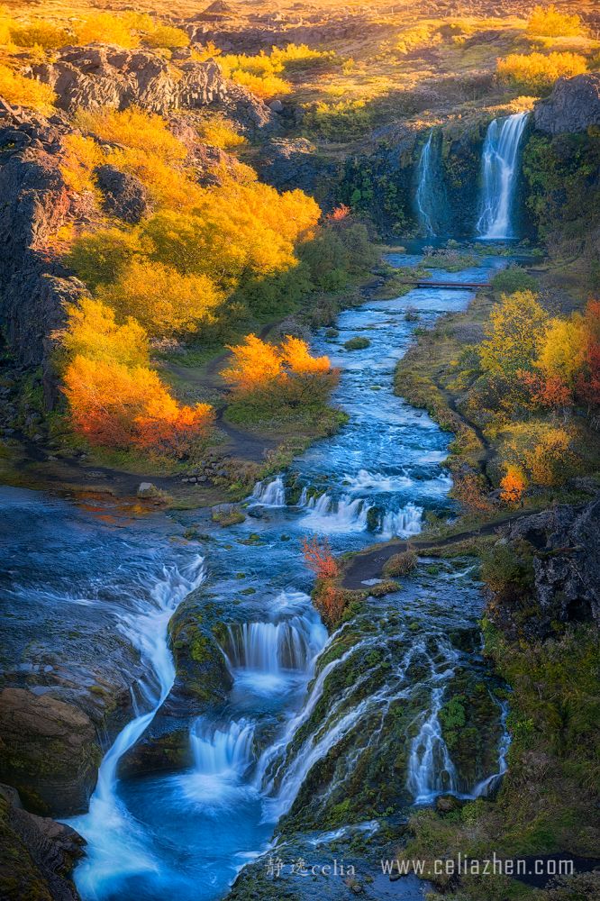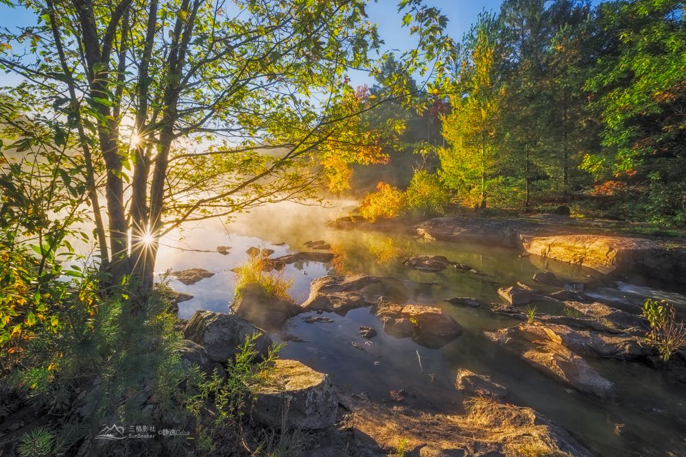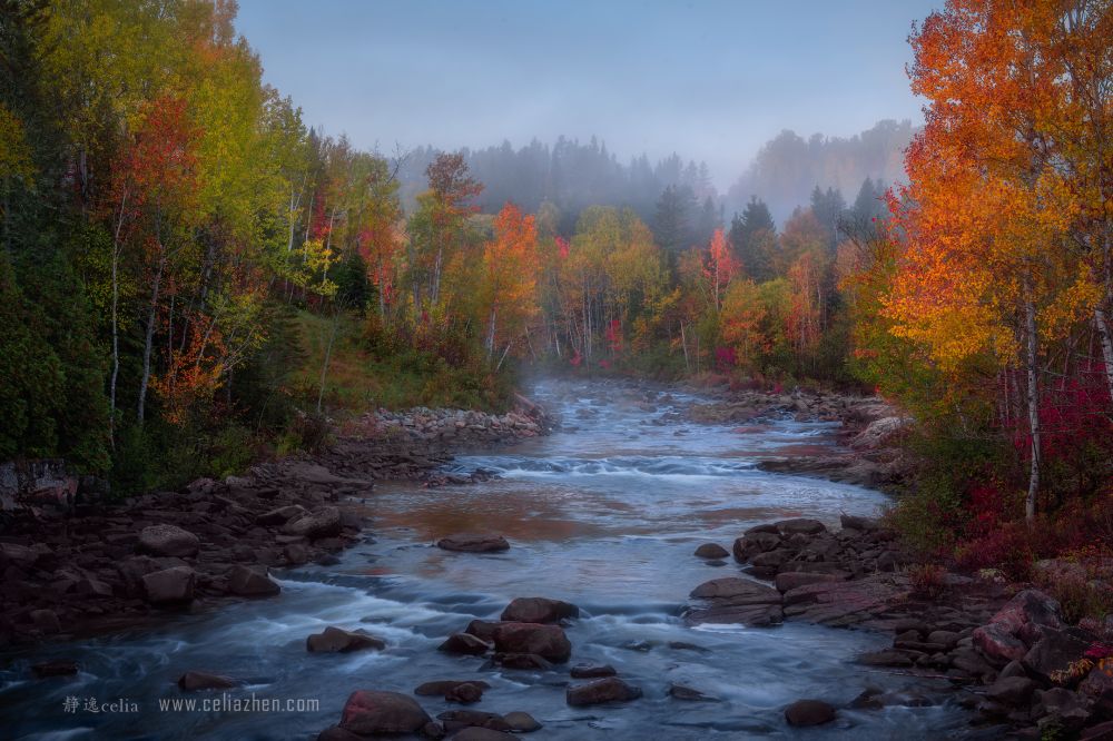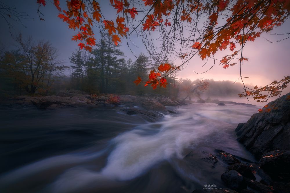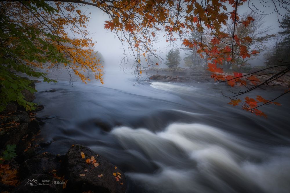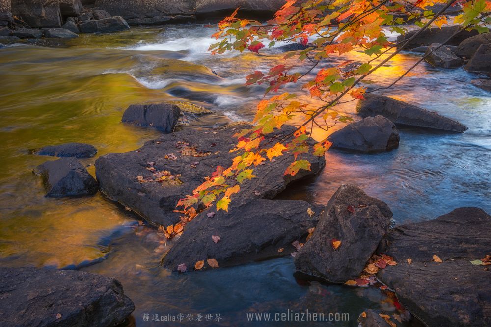 秋色与激流动静结合和色彩的对比为视觉带来更大的冲击力。拍摄河流多数情况下是需要借助ND灰镜减低快门速度让水流产生如丝般的质地: