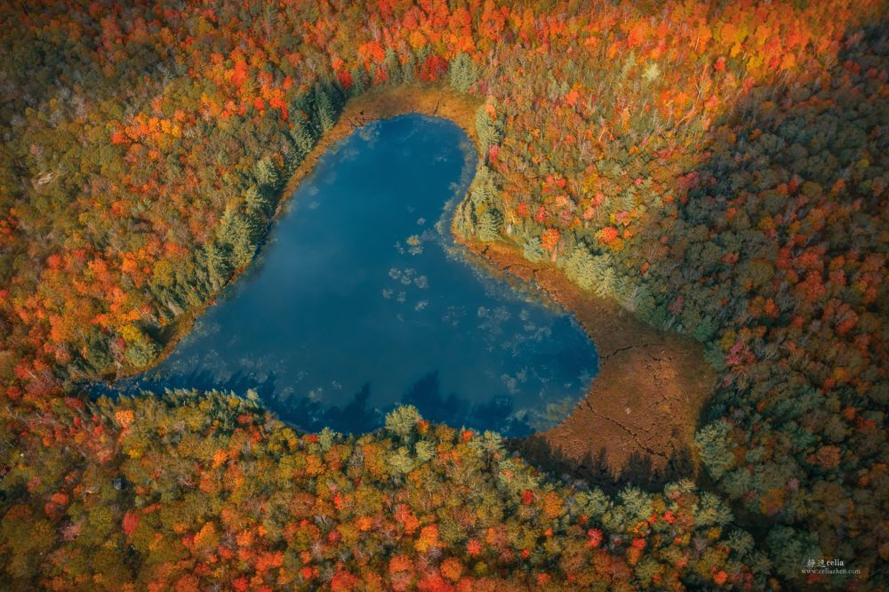 无人机不一定要飞很高才拍摄。无人机可以帮助我们实现需要高于普通三脚架高度的拍摄任务,拍出图片的构图视角能更好展示秋色: