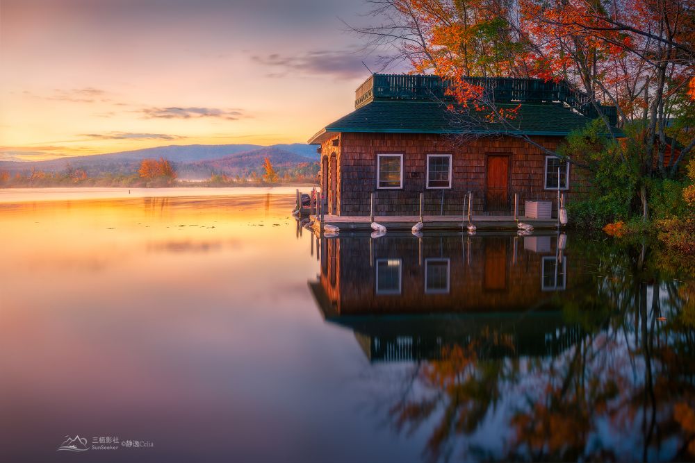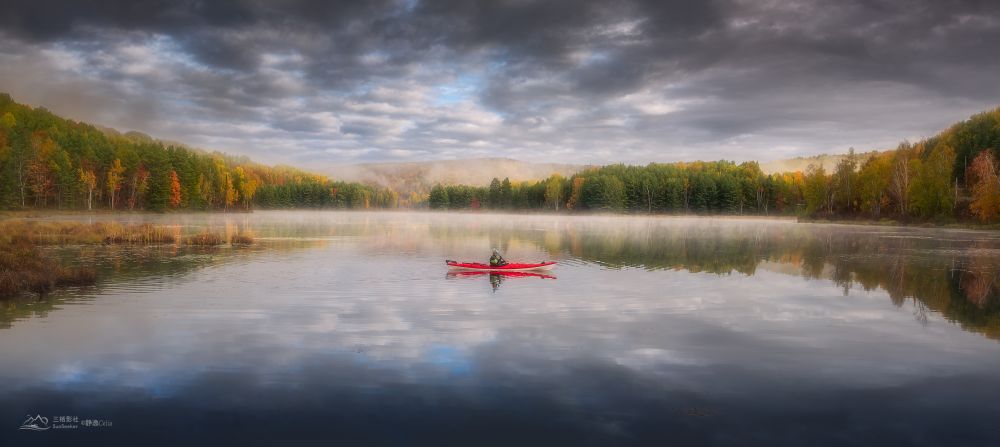 但是安省的秋色缺乏了一个最主要的元素“山”。安省地势平坦,湖泊众多,只好拍摄秋色与水的题材。于是想办法玩些花样,用小船做前景或自己划船提升画面的观赏性: