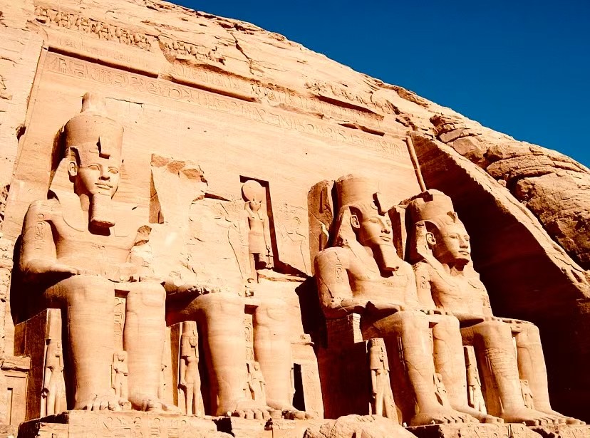 第十八王朝在法老阿肯那顿发起的太阳神阿顿崇拜运动(见之前的叙述)所引起的社会混乱中结束。随后的宗教崇拜的修正开启了第十九王朝。这时候出现了一位著名的法老拉美西斯二世。他的功绩在于与赫梯人在卡迭石的一次战役。双方各出动了多达五万名兵士,两千辆战车。这是人类有史记录以来最大规模的战役。战役结果只能算是平手。古埃及人并没有夺回卡迭石城。但是拉美西斯二世仍然宣称胜利,并且刻成战功碑作为纪念。拉美西斯二世好大喜功,留下很多石刻像。比如,阿布辛贝神庙前的四个巨型石像刻的都是他本人,非常夸张。拉美西斯二世在位六十多年,寿寝于九十五岁,实在是像极了清朝的乾隆帝。这时的古埃及王国国力貌似强大,但是已经在逐渐衰退的路上。